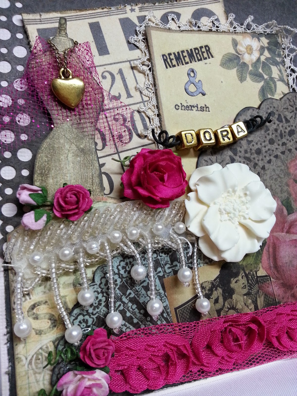 I have used Marian Smith patterned papers and mixed this with flowers, trinkets lace and some very old vintage bead trim from my stash.